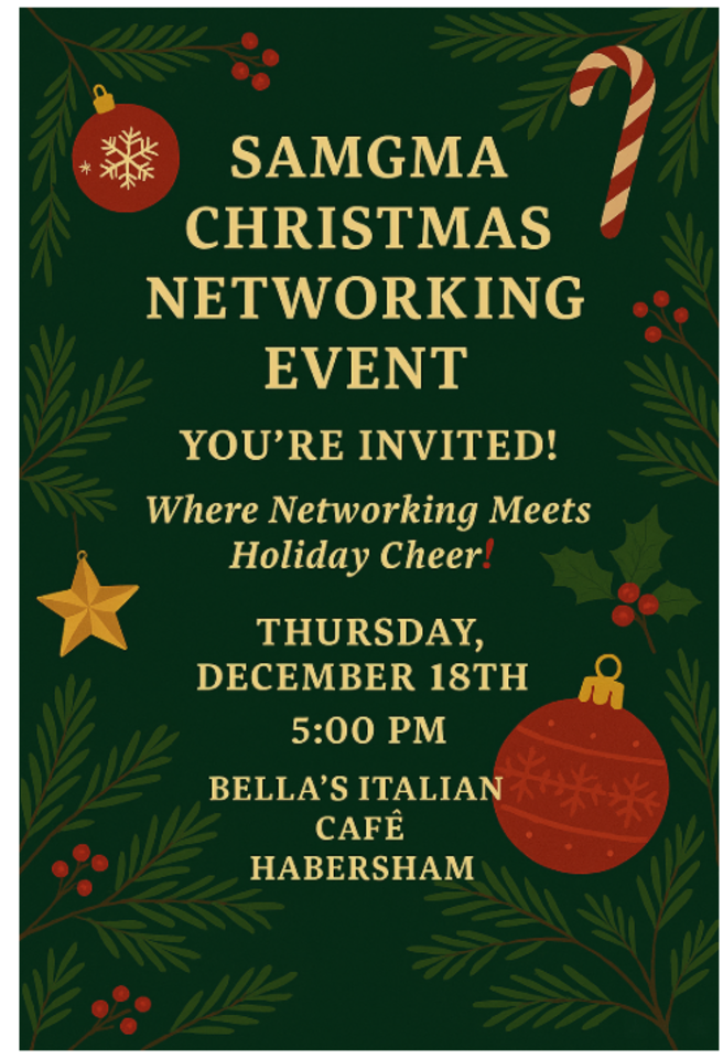SAMGMA gathers for one hour at 12:00 P.M. on the third Thursday of each month. Lunch is provided and there is a formal agenda with guest speakers and door prizes.